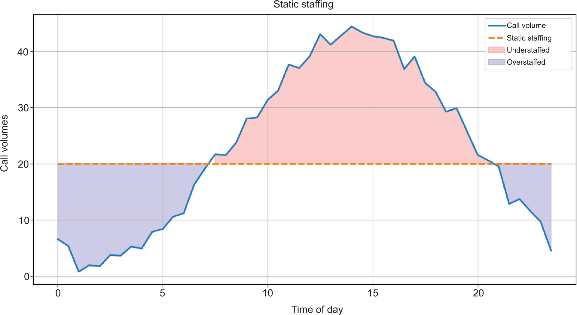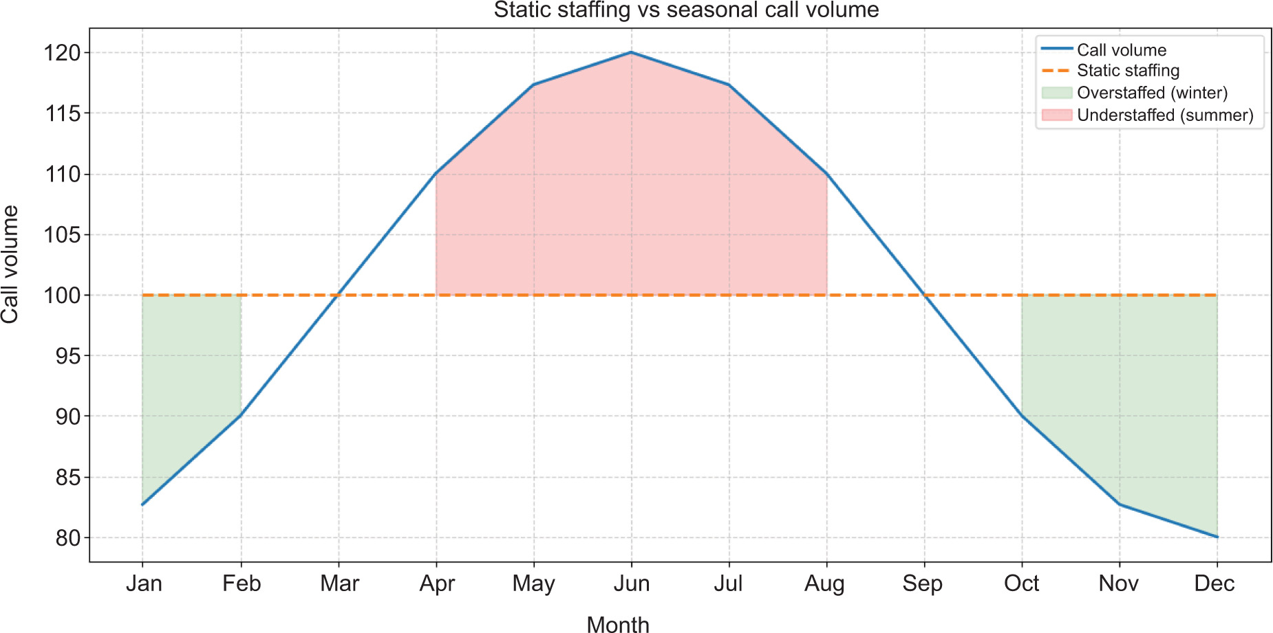These variations are often easily visible in retrospective data, but they are not reflected in static staffing models. A single baseline number that is expected to cover all circumstances will result in predictable inefficiencies. During low-demand periods, a centre will be overstaffed, an expensive mismatch during times of workforce strain and miss opportunities for intentional continuous training or other staff-focused initiatives. During high-demand periods, staffing levels lag behind workload, forcing difficult trade-offs between speed, quality, and employee strain.