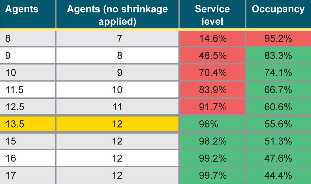 Erlang C provides interval-based staffing requirements but turning those into annual full-time equivalent (FTE) numbers requires additional steps. These include:
